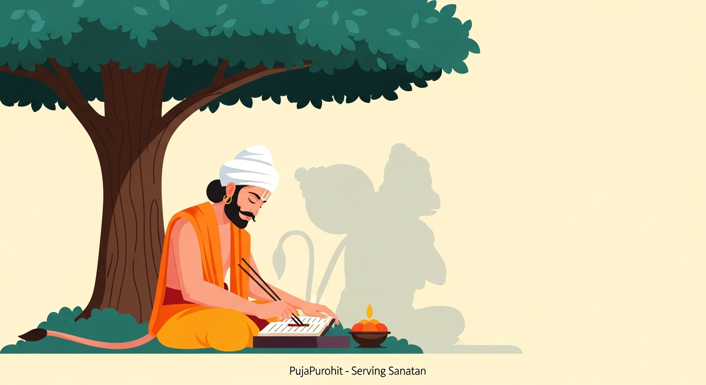 The creation of the Hanuman Chalisa is a story of divine inspiration. It was composed in the 16th century by Goswami Tulsidas, the revered author of the epic 'Ramcharitmanas'. Legend says that Tulsidas composed these verses while imprisoned, where he had a divine vision of Lord Hanuman. In his moment of distress, he sang the praise of the great devotee of Lord Rama, and the 40 verses flowed from his heart, forming the powerful hymn we know today. This composition is deeply rooted in the 'Sundara Kanda' of the Ramayana, which beautifully narrates Hanuman's courage, intelligence, and devotion during his quest to find Sita Mata.
